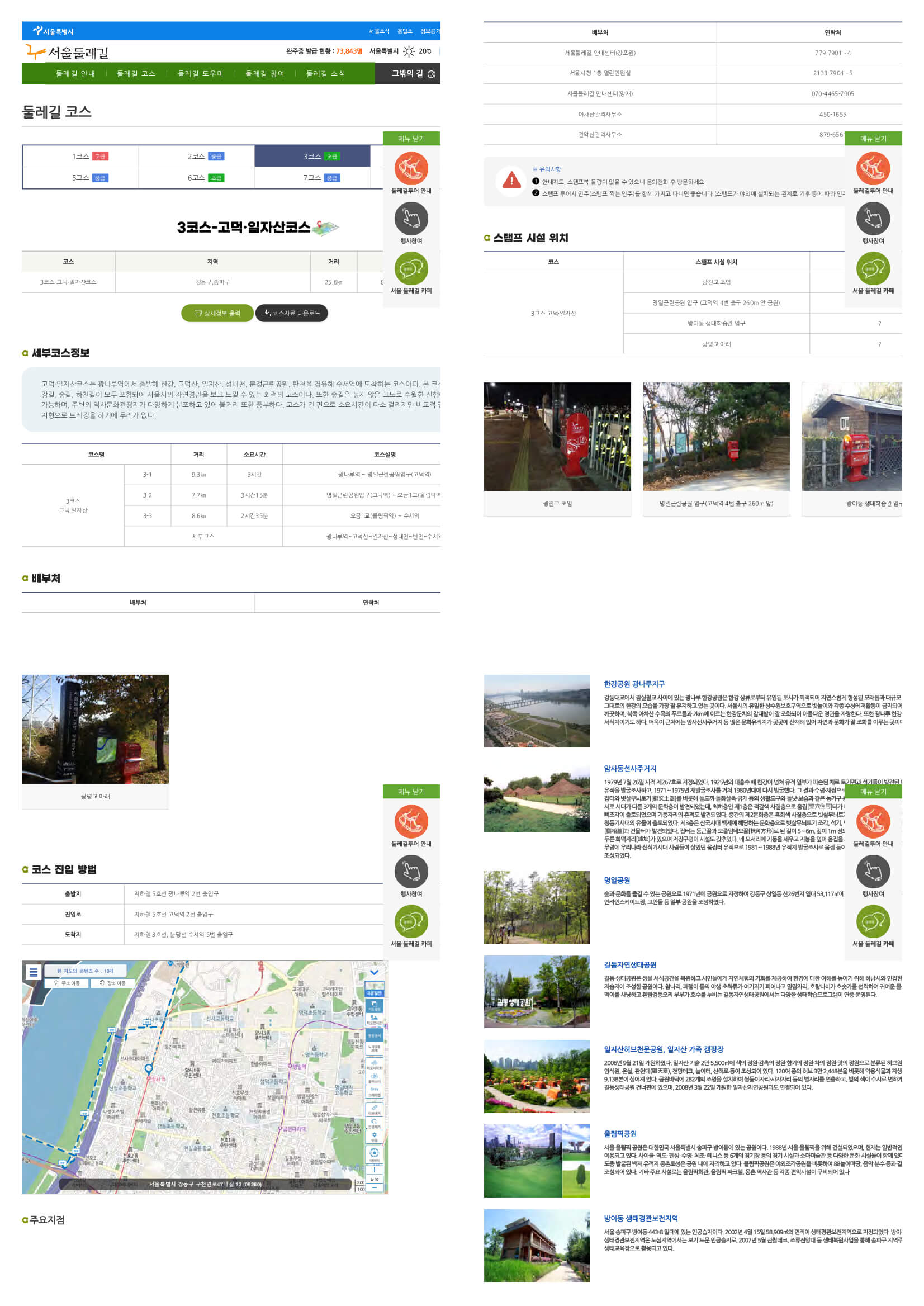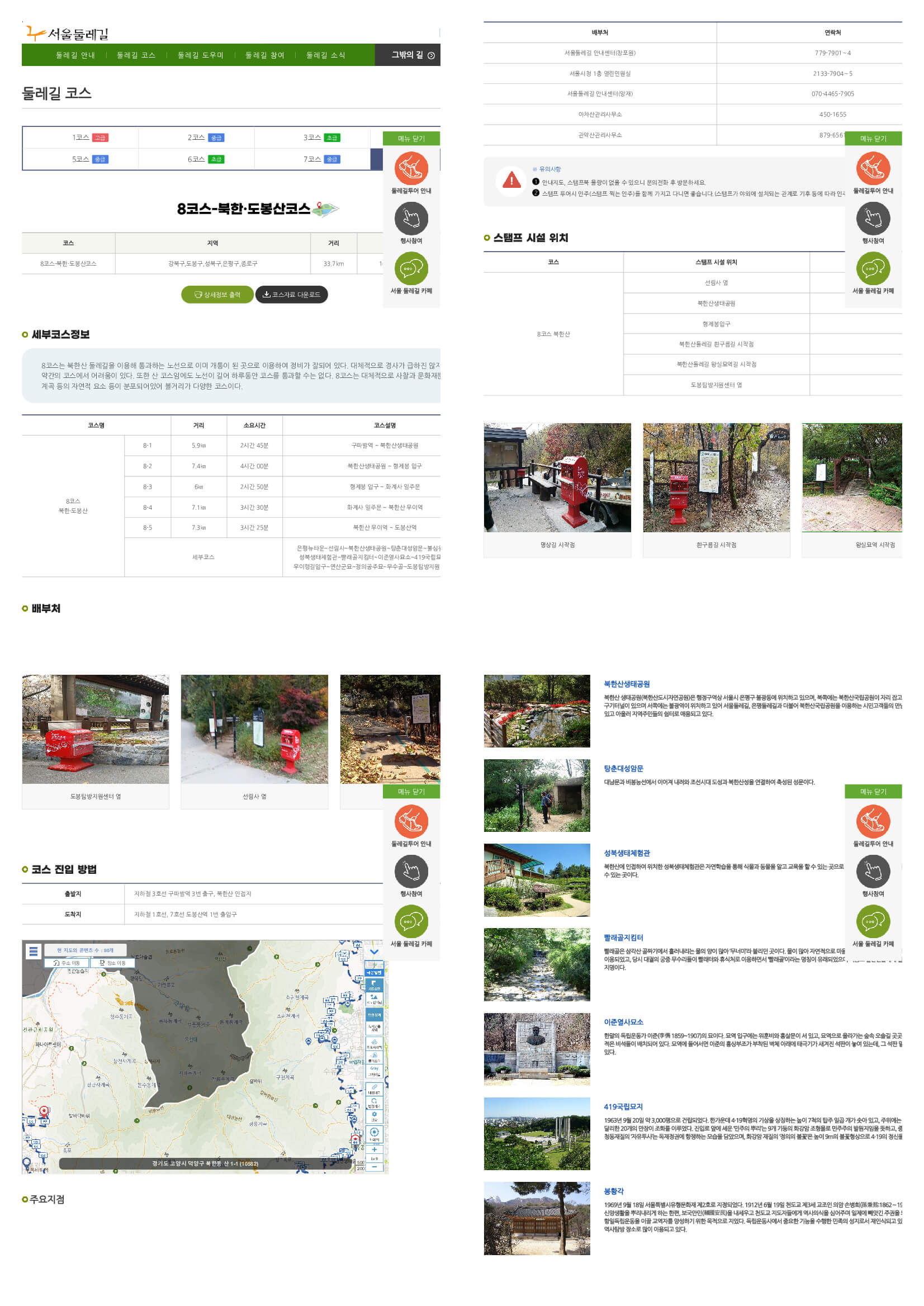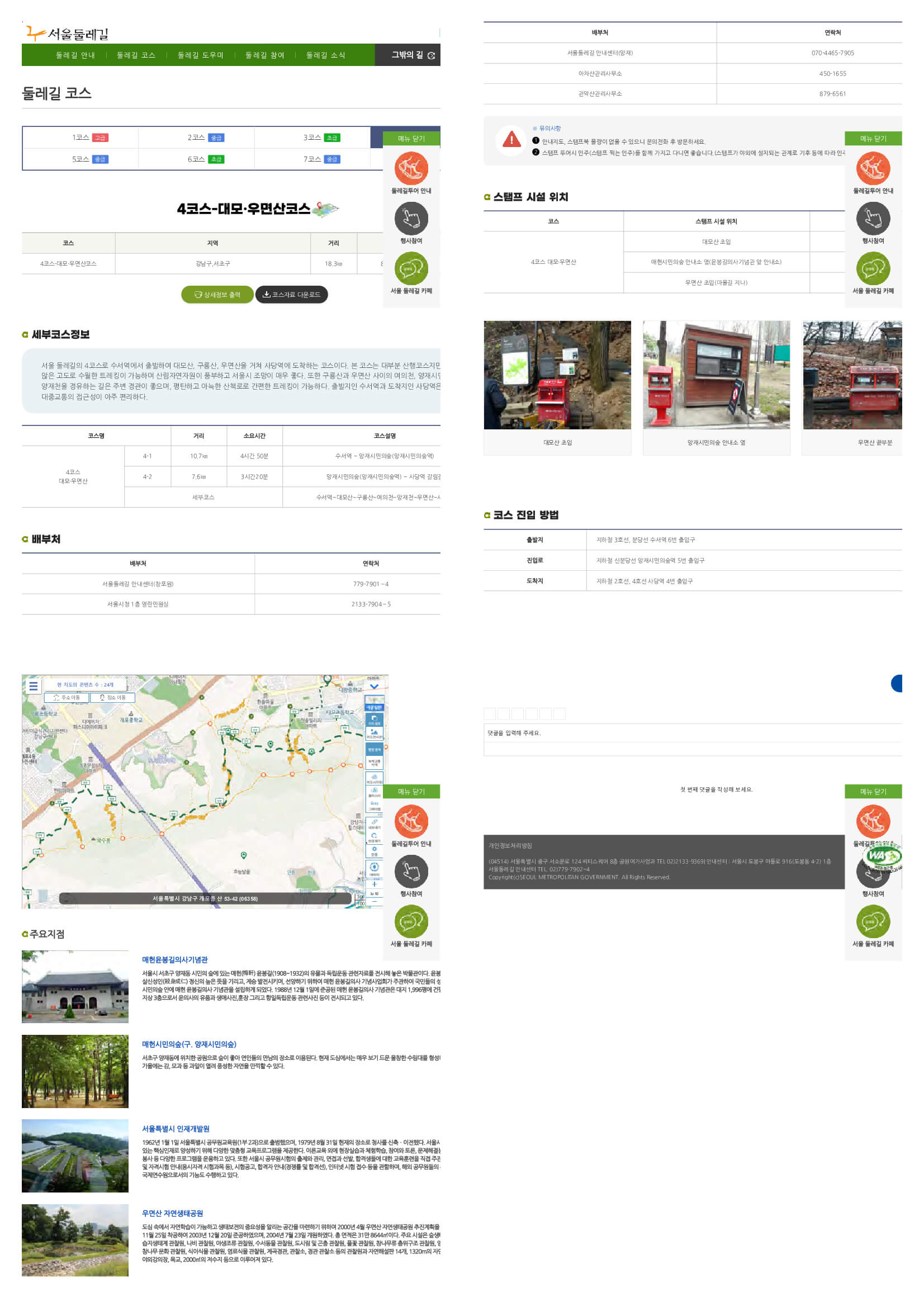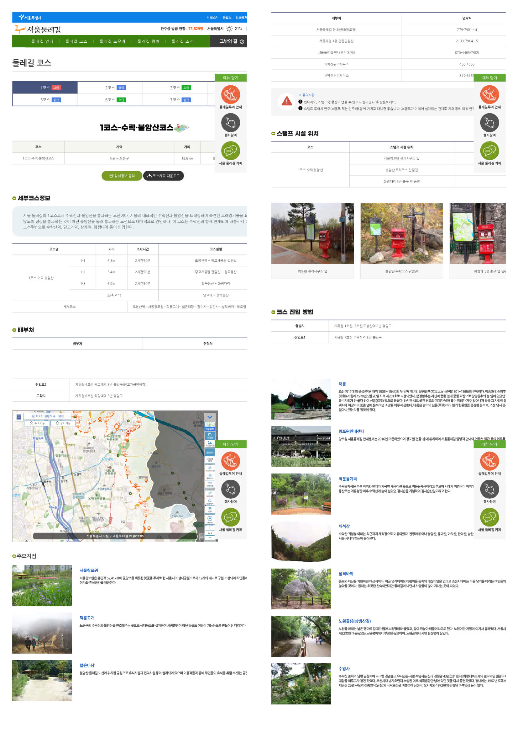 기존 코스별 세부정보, 스탬프북과 안내지도 배부처, 스탬프 설치위치, 진입방법, 주요 지점 등의 상세내용은 서울둘레길 누리집이나 아래 표에서 클릭하시면 바로 확인하실 수 있습니다.