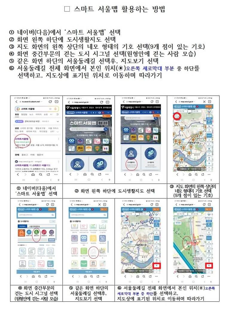 한편, 이에 대한 대안으로 아래에 ‘🌏스마트 서울맵’을 사용하여 위치를 확인하는 방법이 있으니 바로 확인하시고 편안한 둘레길 투어 되시기를 바랍니다. 다만, 상세지도를 사용함으로 통신상태에 따라서 로딩이 지연될 수 있습니다.