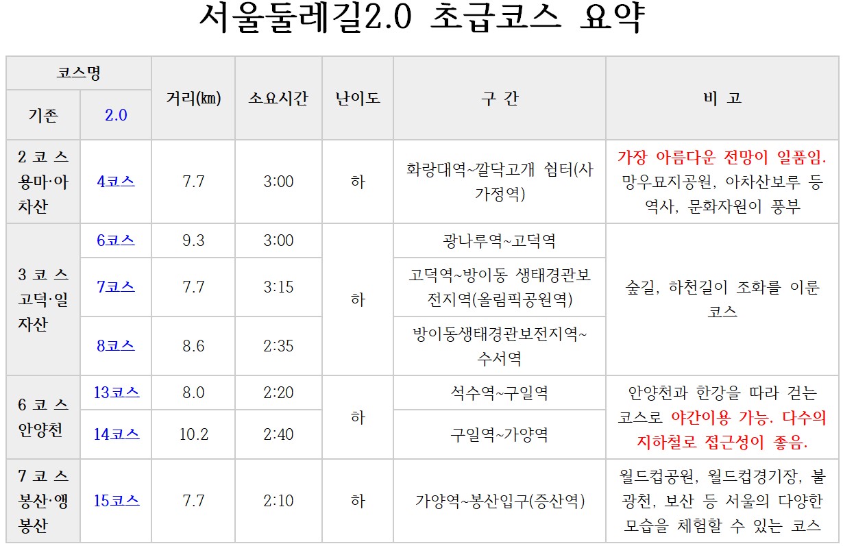 초급자분을 위해서 난이도 하의 서울둘레길2.0 코스를 아래에 추천합니다. 평지이면서 아름다운 경관이 일품이고 야간에도 가능한 코스가 있습니다. 확인해 보시고 즐겁고 안전하게 둘레길 걸어보시면 좋을 듯 합니다.