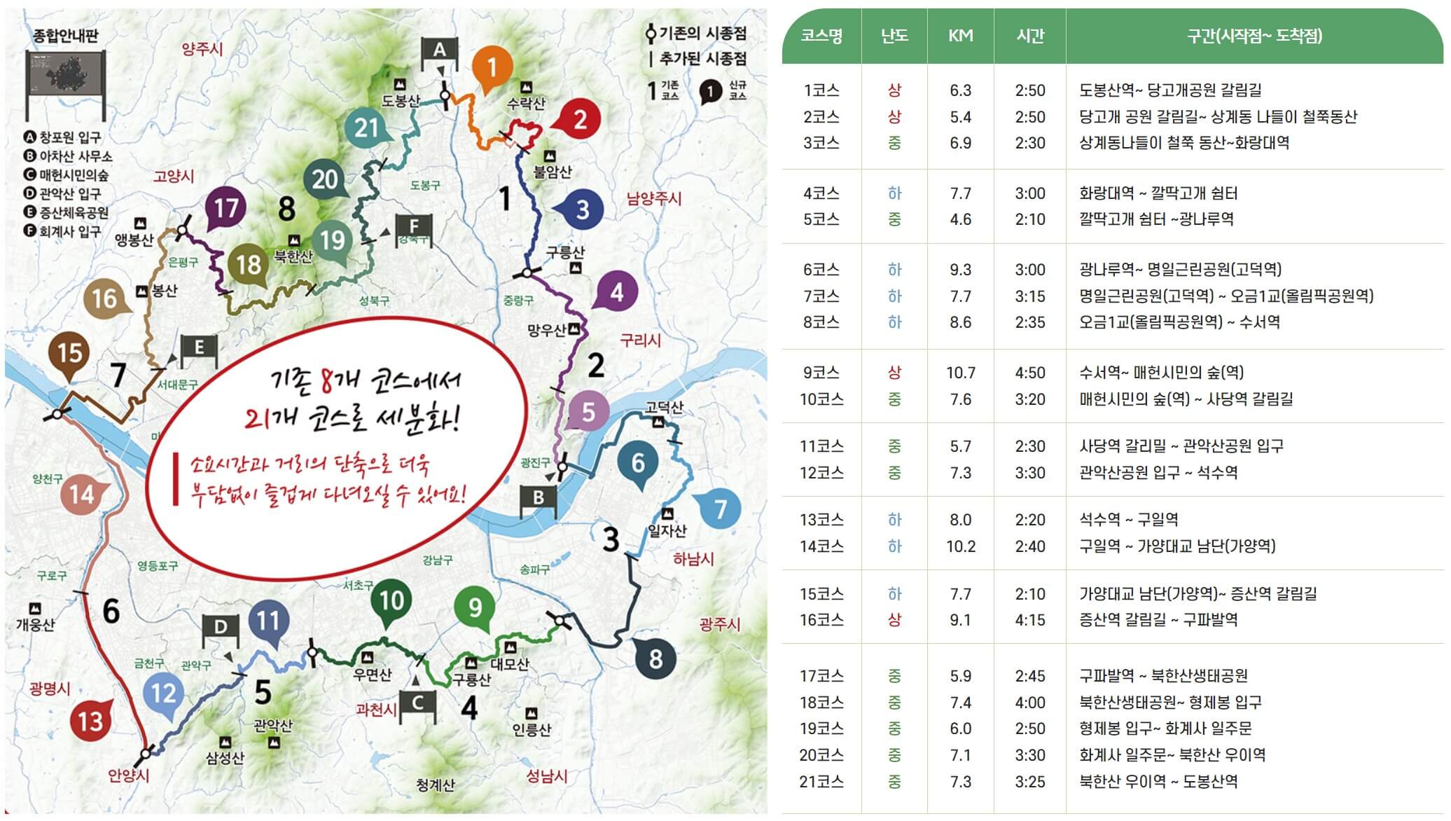 | 코스 세분화 | 👉1 수락-불암산 ▷ 👉2 용마-아차산 ▷ 👉3 고덕-일자산 ▷ 👉4 대모-우면산 ▷ 👉5 관악-호암산 ▷ 👉6 안양천-한강 ▷ 👉7 봉산-앵봉산 ▷ 👉8 북한-도봉산 ▷ |