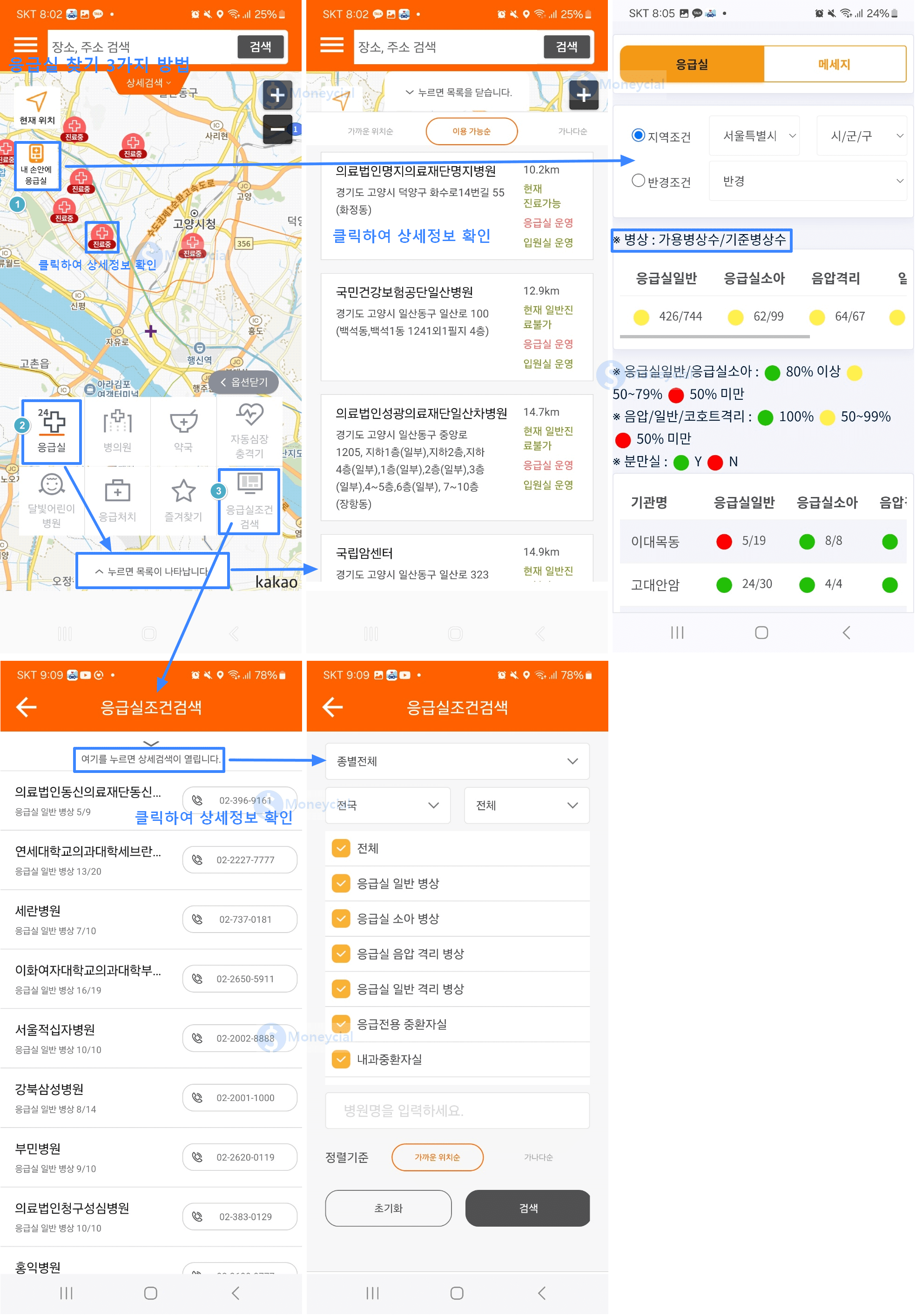 ‘응급실’ 아이콘, ‘응급실 조건검색’ 아이콘, ‘내 손안에 응급실’ 아이콘을 이용하는 3가지 방법이 있습니다.